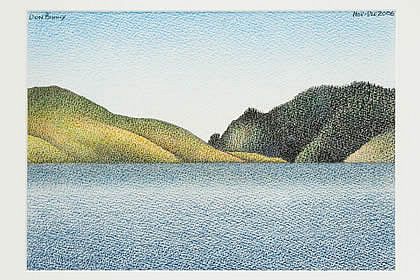 He focused on two regions in particular: the Waitakere Coast west of Auckland which was his best-known ‘territory’ throughout his career; and the Marlborough Sounds, which ‘began to reveal itself’ after his first Marlborough solo exhibition, Vintage Binney, at The Diversion Gallery in 2003, prompting several visits and an evolving series of both drawings and paintings. This was a breaking of new ground by a senior artist known for particular loyalty to places which touch his life deeply. It was evident here in his discovery of the barely populated landforms, the crouching islands, the changing moods of the Marlborough Sounds, the birdlife in bush and on water, the soft southern light.