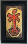 The ungainly but beautiful kererū lumber into the skies carrying hope, urging an intuitive approach. Sustainability and the need for the workers of the land (often represented by his iconic ‘black singlet’ man) to become nurturer are central to recent paintings, often with a gilt sky emphasising ‘icon’ status of certain motifs and figures, including the kererū, the ponga or tree of life, the black singlet man. Brown is also keen to escape the constraints of the ‘rectangle’ format: his painted plywood cutouts counter ‘the cool smooth slickness of our techno society with a rough homemade authenticity’. A black singlet figure remains as a kind of physical labourer needing to evolve into a nurturer. He hopefully needs to be seen as an ongoing painting device or a vehicle for the subconscious rather than as a number eight wire anachronism stuck in the past. Only viewed in this way can he measure up to the challenges facing the planet…