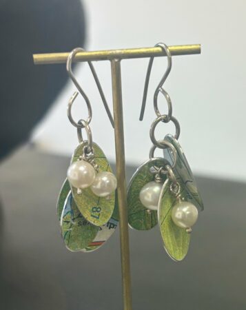 Green Map Earrings Artist: Lynn Kelly Price: NZD185 Medium: Sterling silver, printed map, Pearls Dimensions: 5cm drop Date: 2025 Further work by this artist Pohutukawa Brooch 2024 Rata Earrings Fern brooch 2024 Kowhai Leaf Brooch 2024 Kowhai Leaf Earrings 2025 Balance Earrings Flower Earrings Kowhai Pin Map Brooches Lacebark Necklace Blue Map Earrings Fishing Lure Pendant